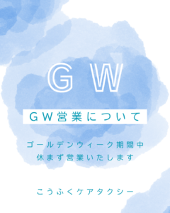 ゴールデンウィーク期間中の営業について 2026年4月23日 最終更新日時 : 2026年4月23日 koufuku こうふくケアタクシーはゴールデンウィーク期間中も【休まず営業】いたします。 通院・転院・お買い物・お出かけなど、お困りの際はお気軽にご相談ください。 「連休中で頼めるところがない...」そんな時こそ、お力になれれば幸いです。 ご予約、お問い合わせはお早めに!!皆さまのご利用を心よりお待ちしております。 \ 最新情報をチェック /